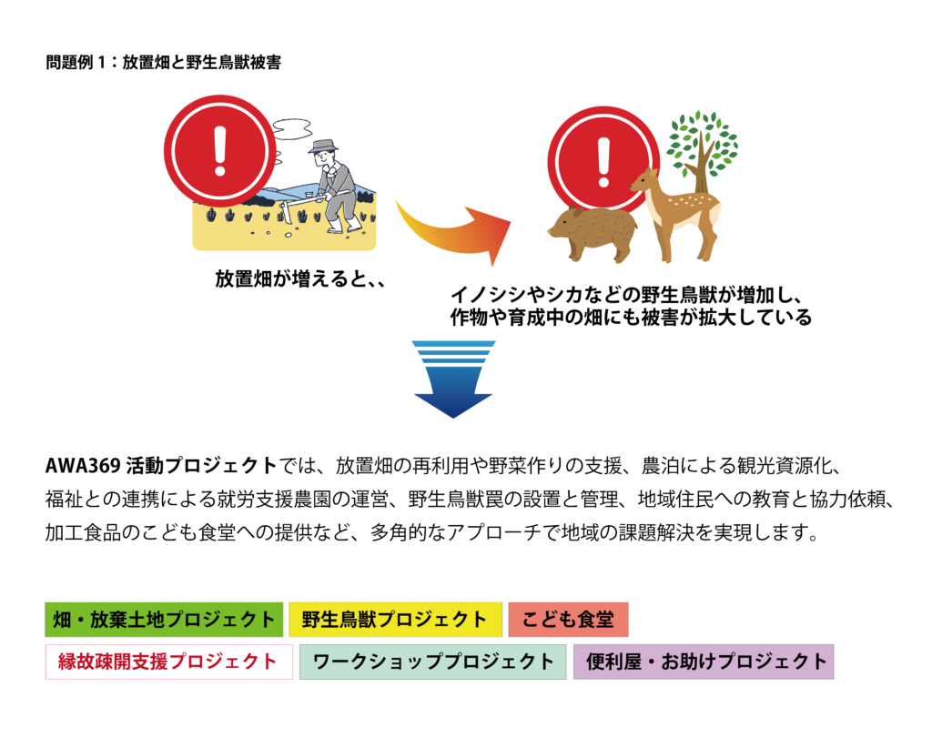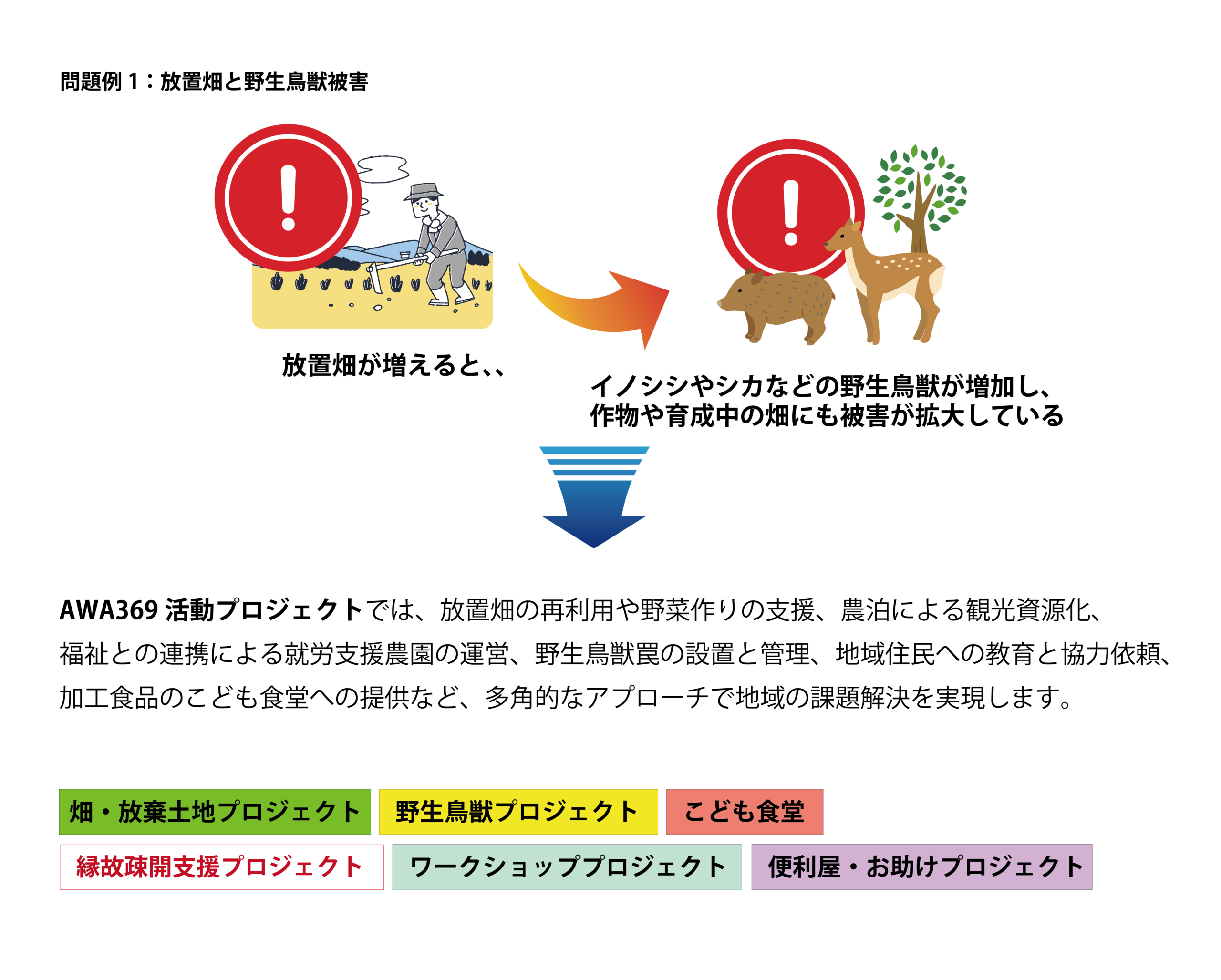 特定非営利活動法人AWA369(アワ サンロクキュー) 代表 小林圭は館山市で漁業に携わる中、安房地域が抱える深刻な課題―高齢化や孤立、格差や貧困、農林漁業の担い手不足、そして未利用魚の大量廃棄という現実に直面し、強い問題意識を持つようになりました。空き家や耕作放棄地の再生活用、獣害対策、就労支援や共生型の居場所づくり、未利用魚を活用したこども食堂、フードバンクなど、地域の中で「できること」を少しずつ形にし、不安な世の中で、補い合いあえる循環型社会を目指しています。